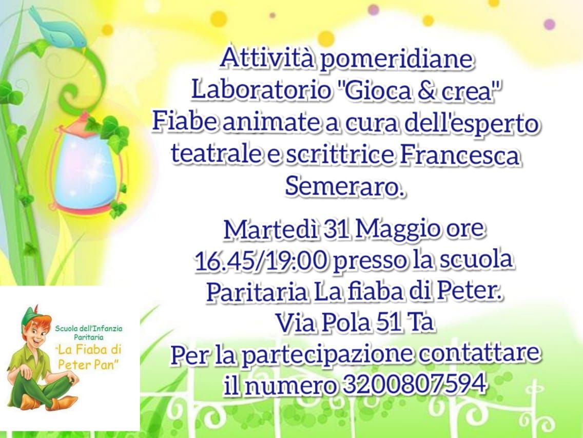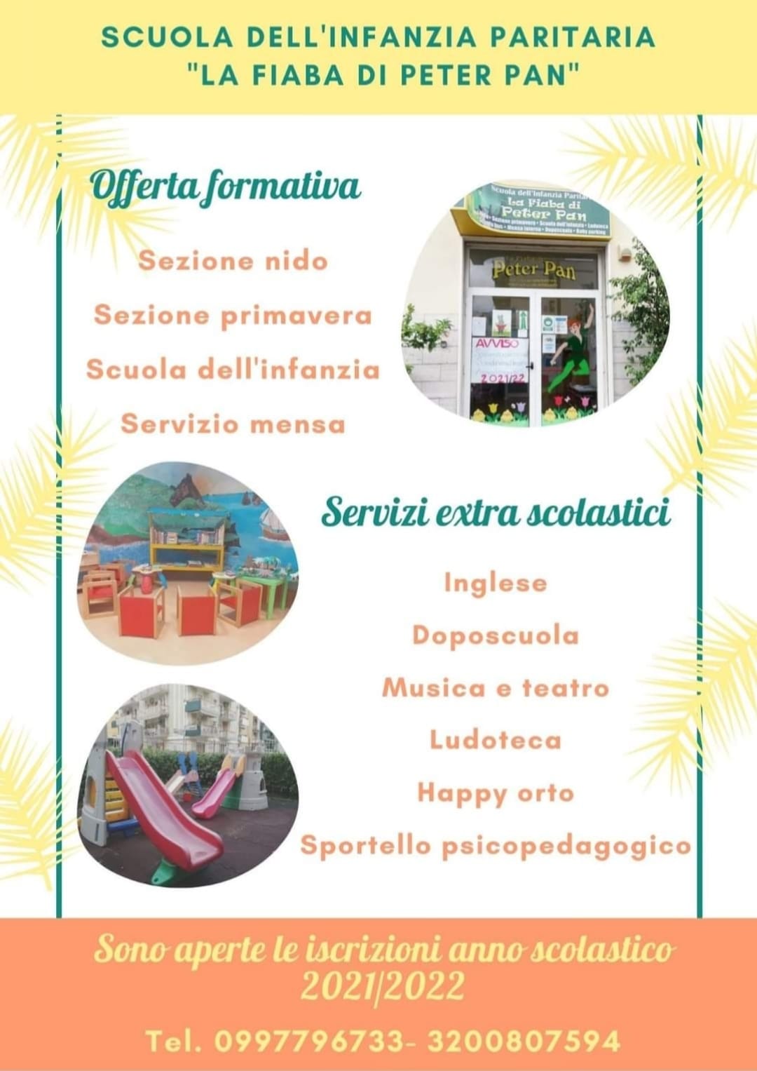 La Fiaba di Peter Pan Scuola dell'Infanzia, situata in Via Pola 51, è il punto di riferimento per le famiglie di Taranto che desiderano affidarsi a personale specializzato nell’accudimento dei più piccini. L’asilo è stato recentemente ristrutturato ed e' stato realizzato il parco giochi esterno con pavimentazione in Polishock, un materiale speciale che attutisce le cadute dei bambini. Tante le attività creative, i laboratori didattici e i giochi offerti ai bimbi a seconda della loro età. L’asilo propone inoltre un servizio doposcuola per ragazzi anche più grandi. Scoprite il programma formativo e di crescita offerto dall’istituto infantile più affidabile e accogliente di Taranto! Chiamate subito per maggiori informazioni e per iscrizioni.